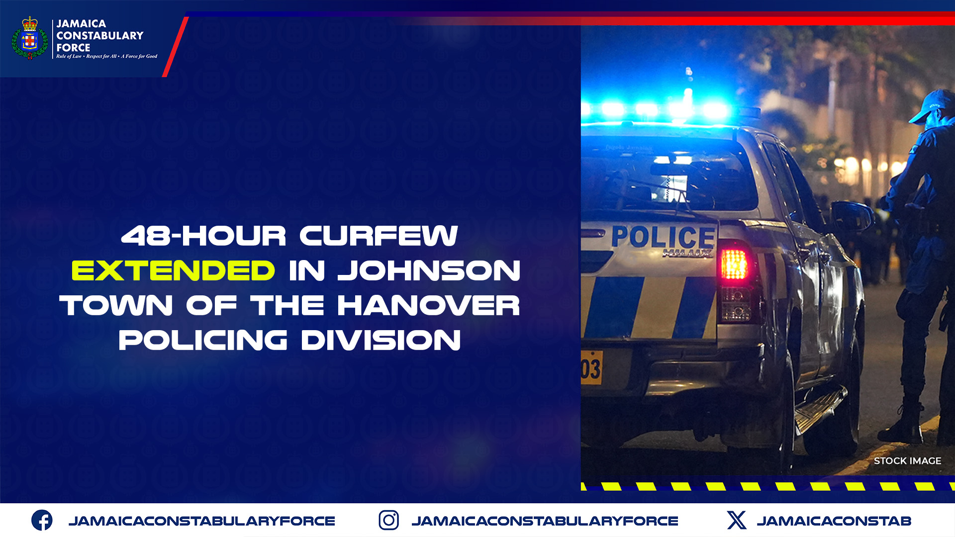 The 48-hour curfew that was imposed in Johnson Town, of the Hanover Policing Division, has been extended. The curfew will continue from 6:00 p.m. on Saturday, February 07, and will remain in effect until 6:00 p.m. on Monday, February 09.