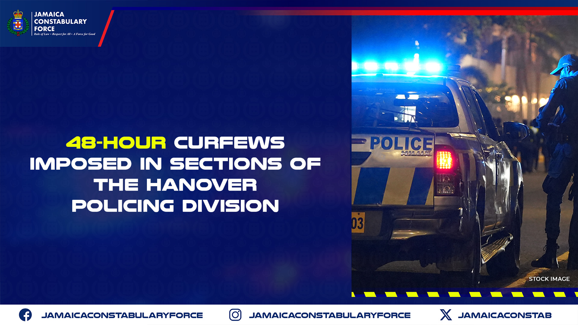 January 30, 2026 – A 48-hour curfew has been imposed in sections of Jericho and Elgin Town communities in the Hanover Policing Division. The curfews commenced at 6:00 p.m. on Friday, January 30, and will remain in effect until 6:00 p.m. on Sunday, February 01.