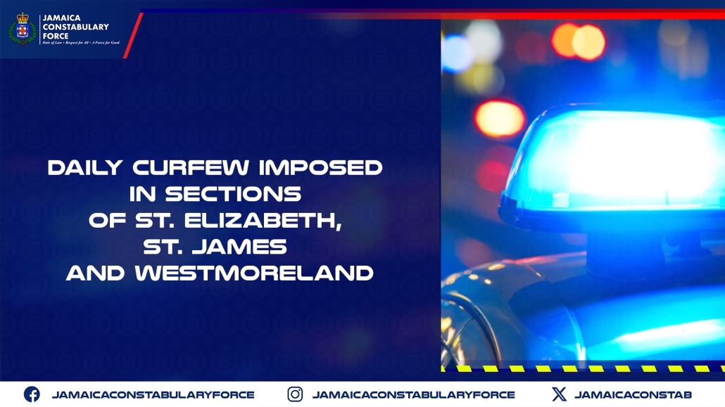 Effective Wednesday, November 12, a daily curfew will be imposed in sections of St. Elizabeth, St. James, and Westmoreland. The curfews will run from 10:00 p.m. nightly until 6:00 a.m. the following day.