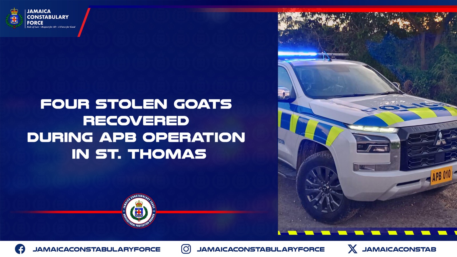 Lawmen assigned to the Agricultural Protection Branch (APB) Area 5, along with members of the St. Thomas Police Division, recovered four stolen goats valued at approximately JMD $390,000 during an intelligence-led operation conducted in Glasgow, Whitehall, in the parish, on Friday, November 21.