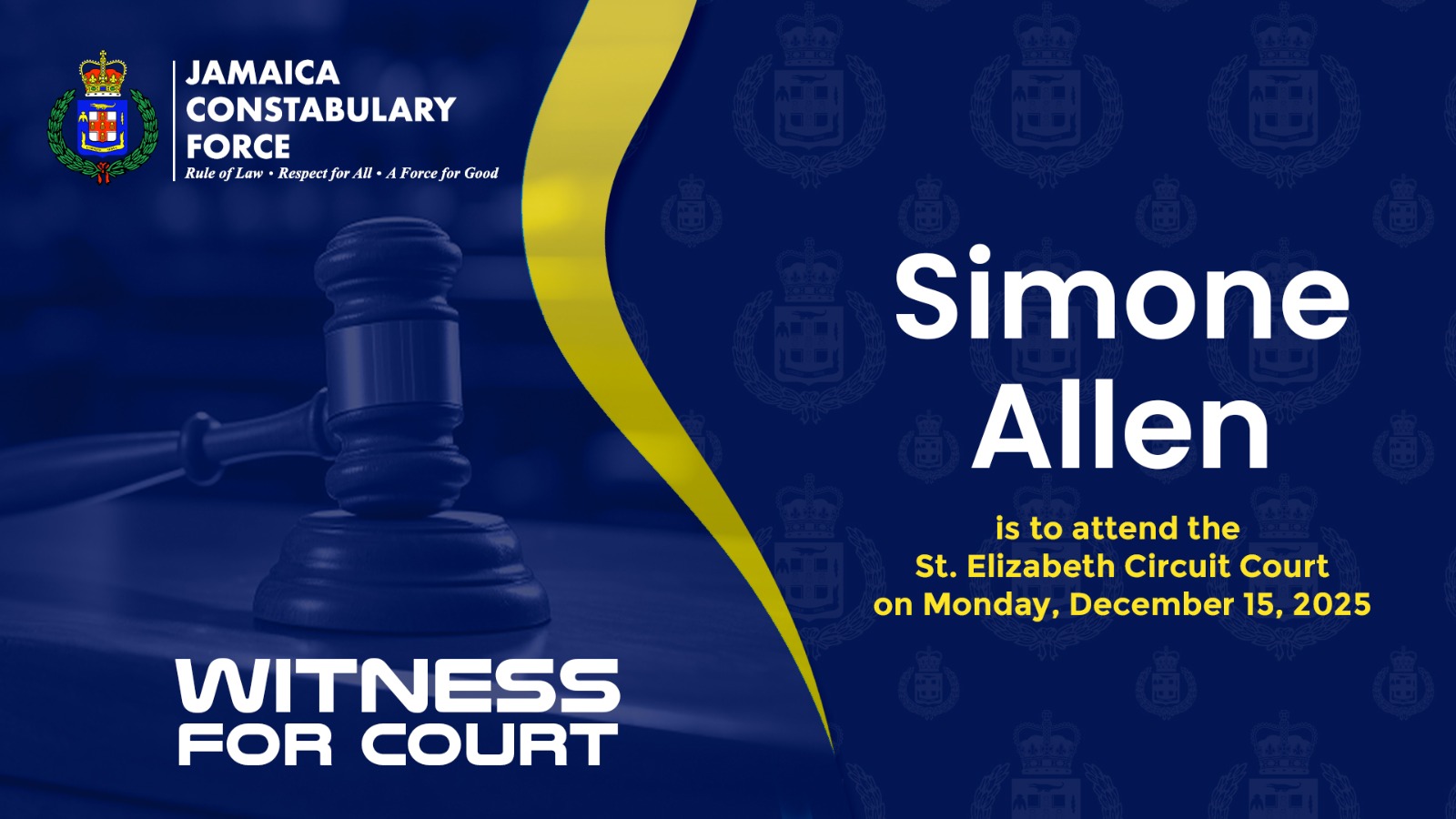 Detectives assigned to the St. Elizabeth Policing Division are seeking the public’s assistance in locating a witness who is vital to a case currently before the St. Elizabeth Circuit Court.